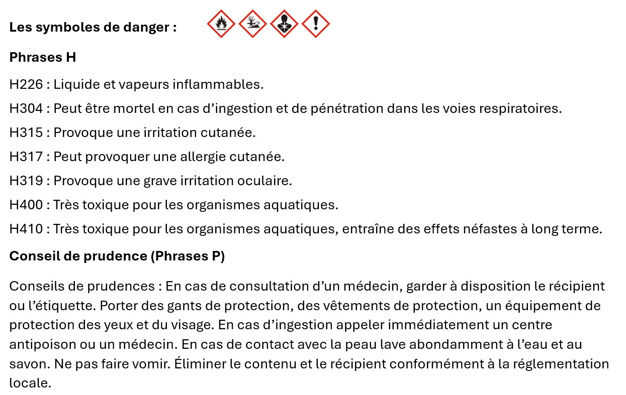 | Précautions | Cette huile essentielle contient un composant biochimique allergène (limonène environ 10%) |